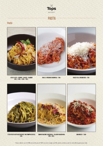 Aglio e Olio / Shrimp / Bacon / SALMON Basil & oregano Marinara / 249.- Roast Chili Arrabbiata / 249.-